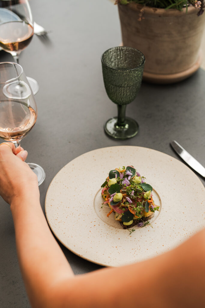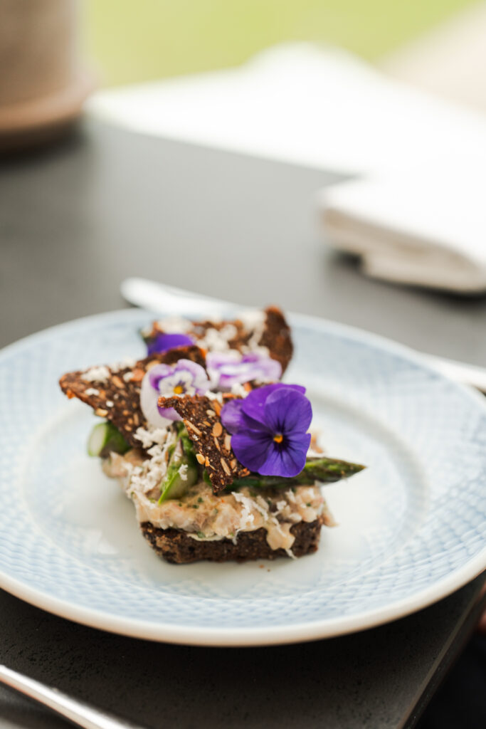 Hvis vejret tillader det, er du hjertelig velkommen til at nyde din frokost på vores udendørs terrasse. Her kan du samtidig nyde den smukke udsigt over herregårdsparken, hvor mange af menuens råvarer dyrkes og høstes.